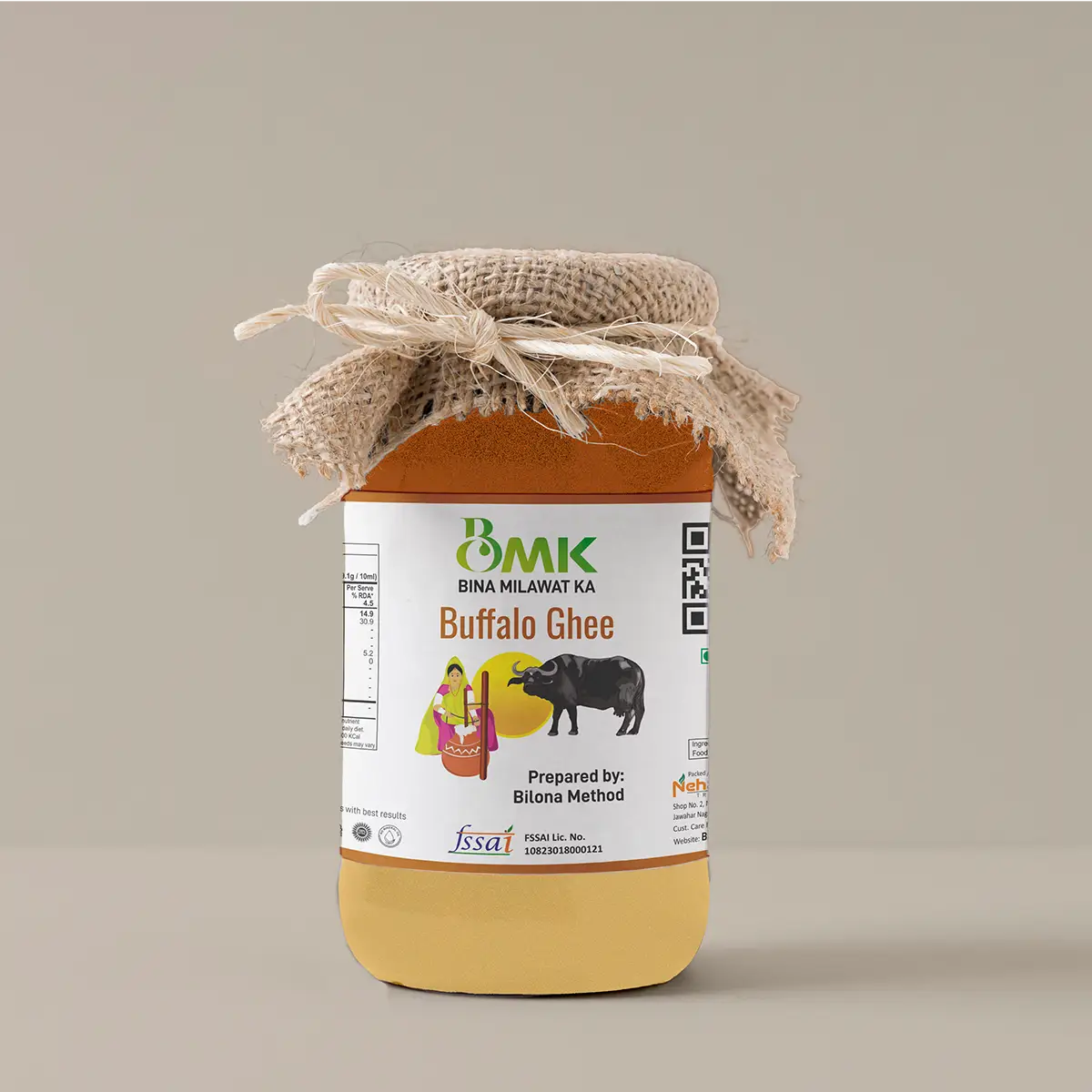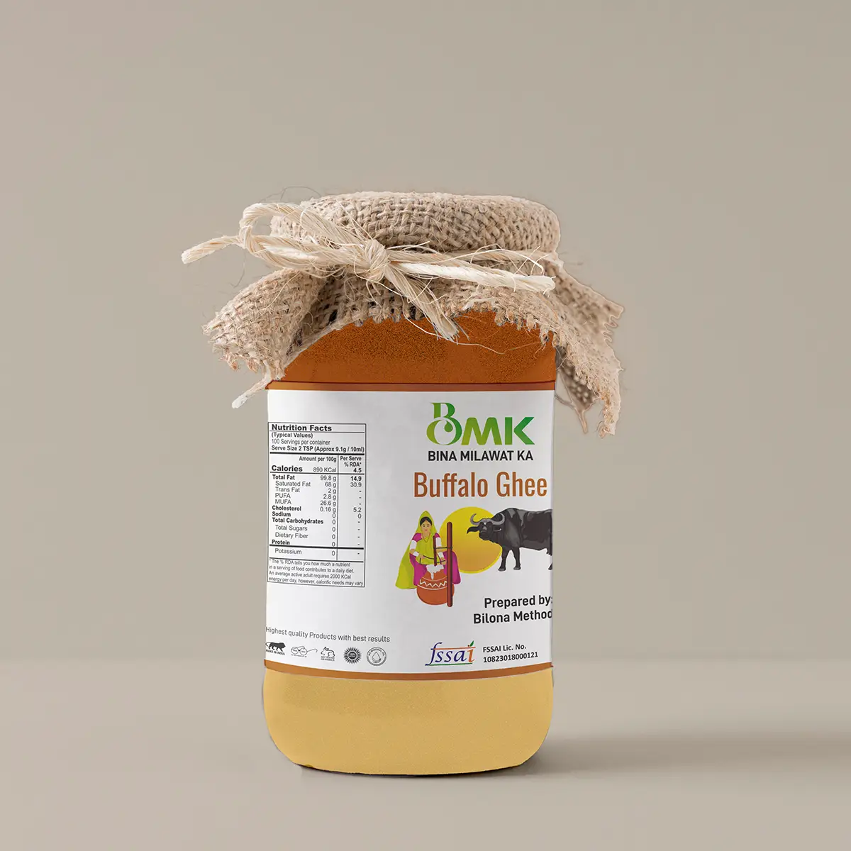 The Bilona process involves churning buffalo milk in a traditional wooden churner, preserving its natural aroma, flavor, and nutrients. This ancient technique ensures that every drop of ghee retains the richness and authenticity of buffalo milk.